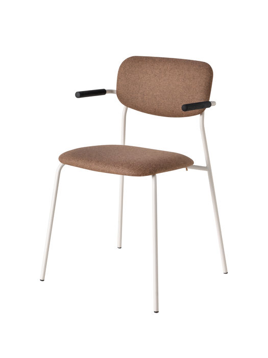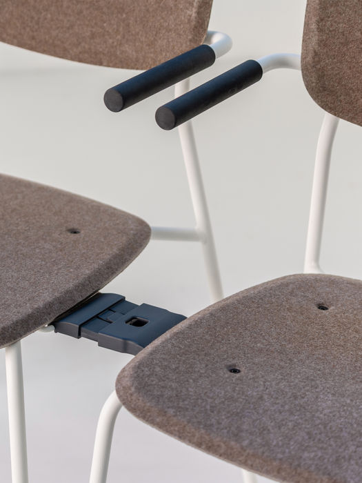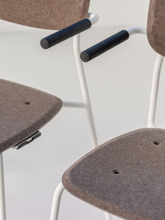 Het gebruikte vilt bestaat uit 100% gerecycled post-consumer PET, of in de gekleurde variant uit een mix met gerecycled materiaal. Armleggers zijn standaard in zwart kunststof (rond model), maar kunnen optioneel ook in hout (gelakt, gebeitst of gelakt in kleur) uitgevoerd worden.